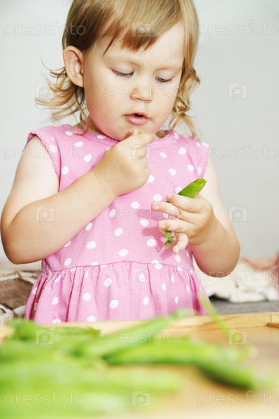 Девочка в платье ест горох