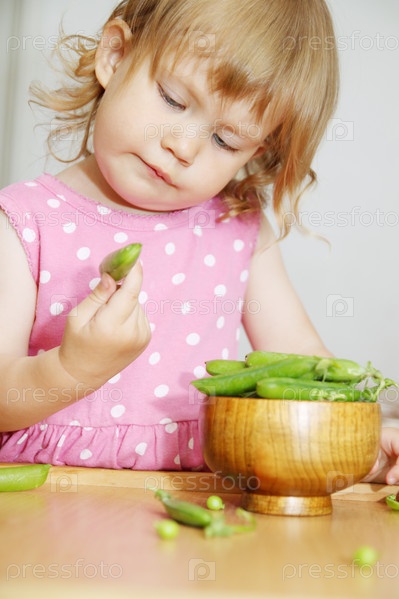 Девочка в платье в горошек ест горох