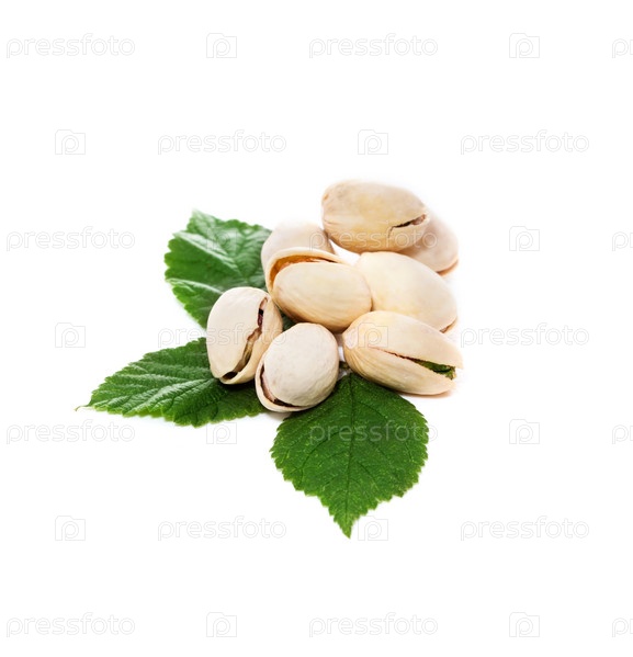 Фисташковые орехи с листьями. Изолированные на белом фоне