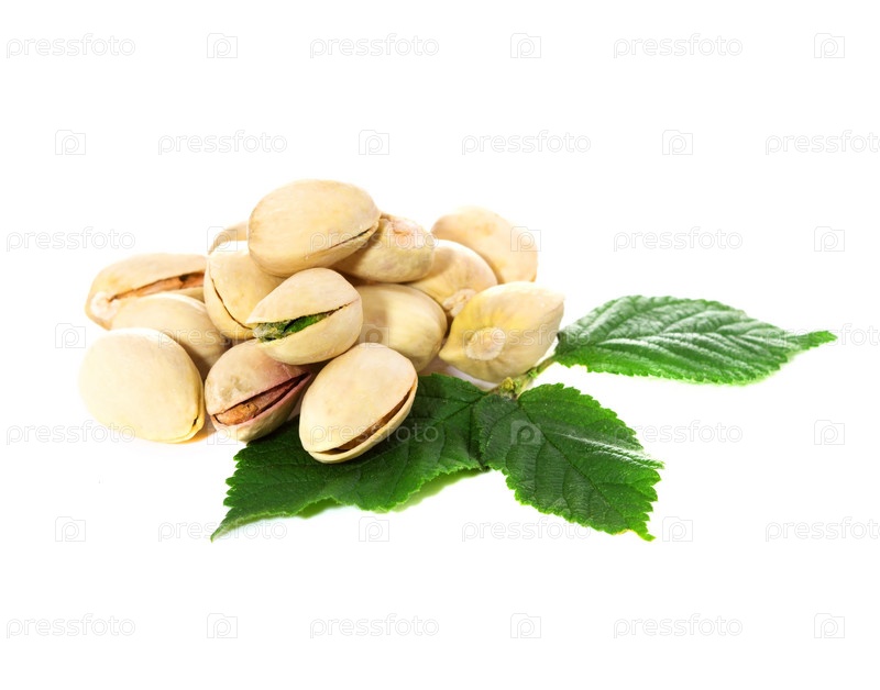 Фисташковые орехи с листьями. Изолированные на белом фоне