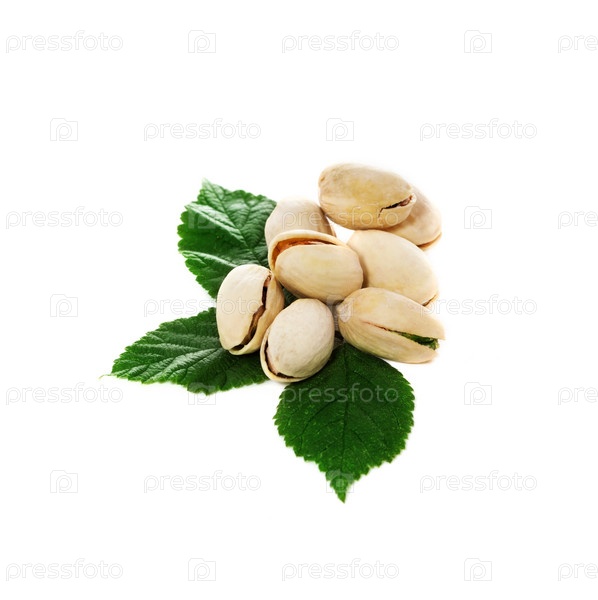 Фисташковые орехи с листьями. Изолированные на белом фоне