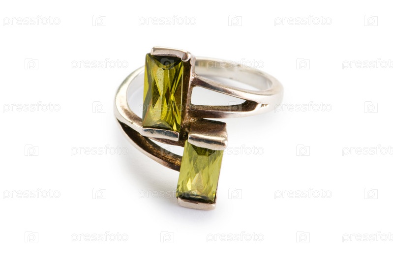 Кольцо с двумя зелеными камнями на белом фоне