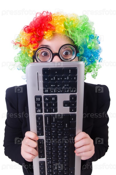 Забавный клоун с клавиатурой на белом фоне