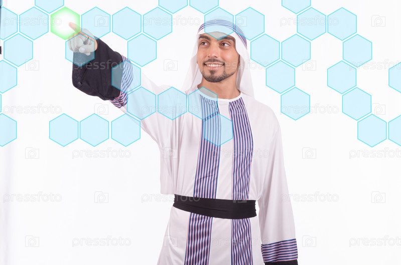Арабский бизнесмен нажимает на виртуальную кнопку