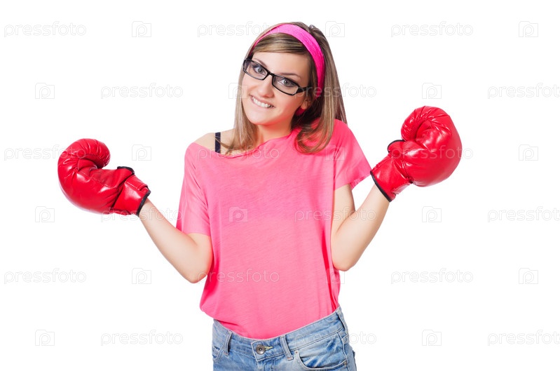 Молодая леди с боксерскими перчатками на белом фоне