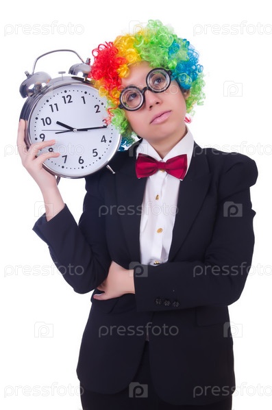 Забавный клоун с часами на белом фоне