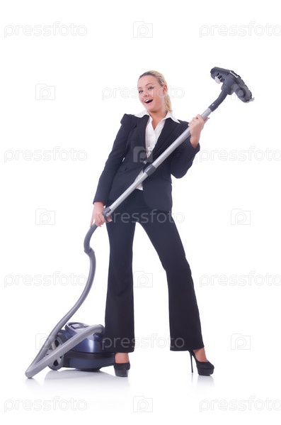 Бизнес-леди с пылесосом на белом фоне