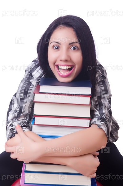 Девушка-студентка с книгами на белом фоне