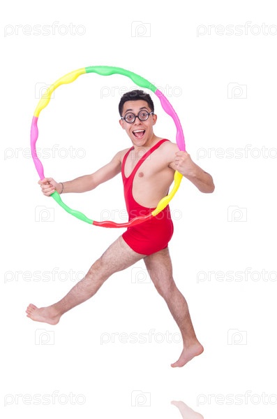 Смешной спортсмен с хула-хупом на белом фоне
