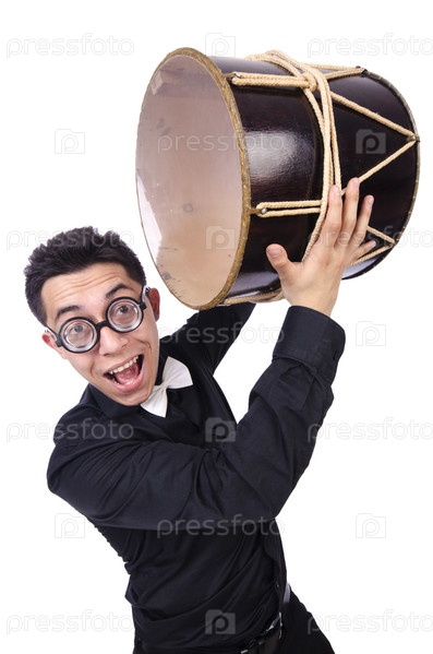Забавный человек с барабаном на белом фоне
