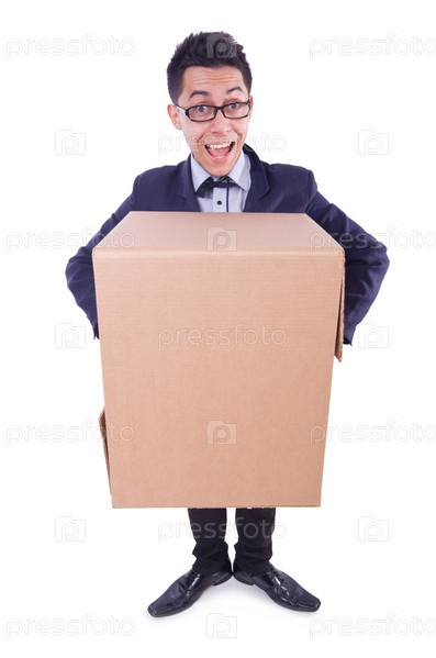 Забавный человек с коробкой на белом фоне