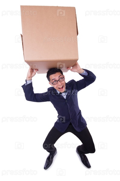 Забавный человек с коробкой на белом фоне