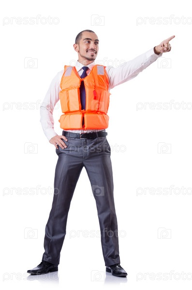 Мужчина в спасательном жилете на белом