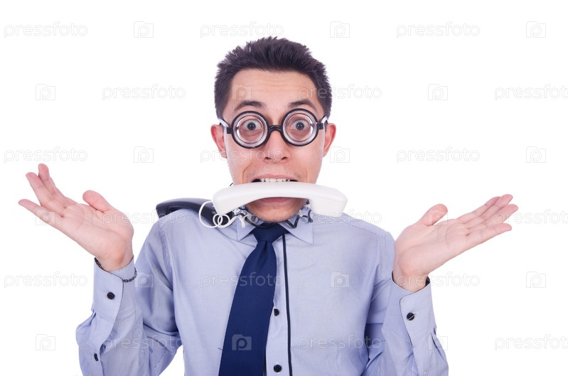 Сумасшедший человек с телефоном на белом фоне