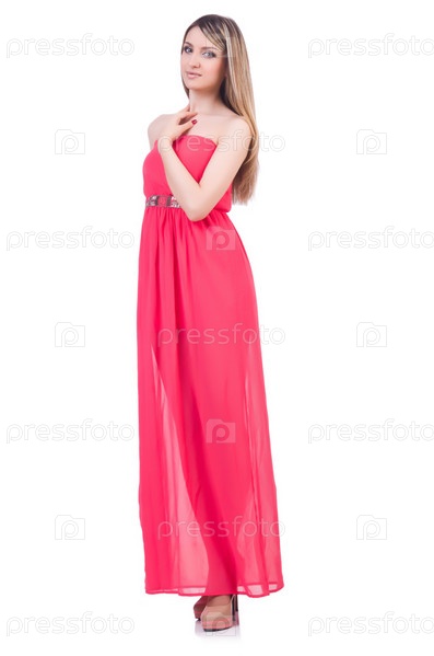 Женщина в модной одежде на белом фоне