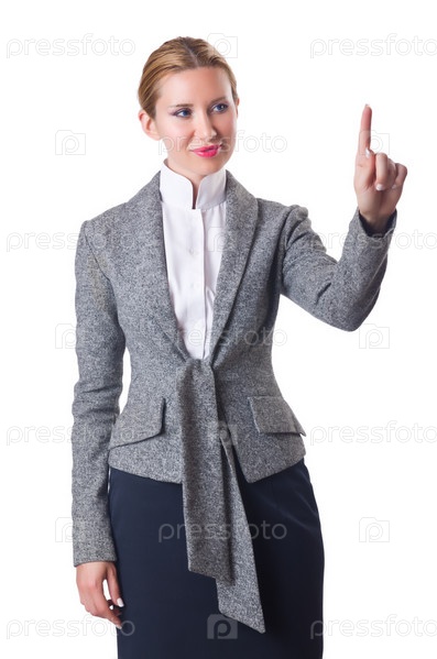 Женщина-предприниматель нажимает виртуальную кнопку на белом фоне