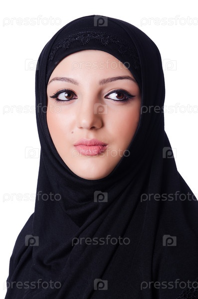 Мусульманская молодая женщина в хиджабе на белом фоне