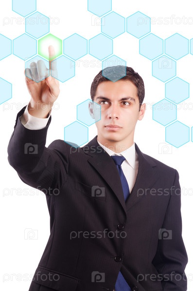 Молодой бизнесмен нажимает на виртуальные кнопки