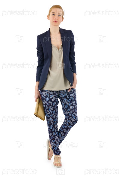 Женщина в модной одежде на белом фоне