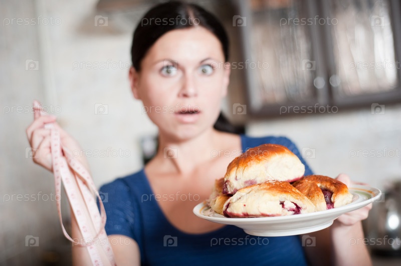 Молодая женщина держит пирог и сантиметровую ленту