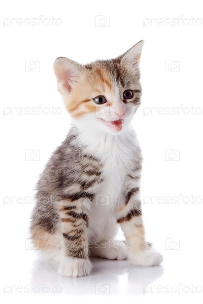 Разноцветный маленький котенок сидит на белом фоне
