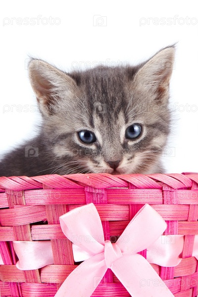 Серый котенок в розовой корзинке с бантом