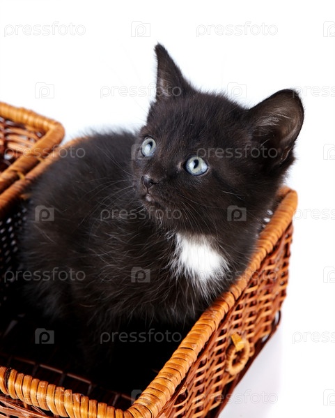 Черный маленький котенок в плетеной корзине