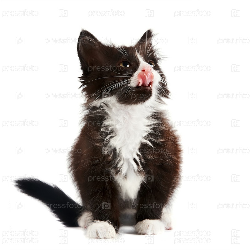 Черно-белый котенок облизывает губы