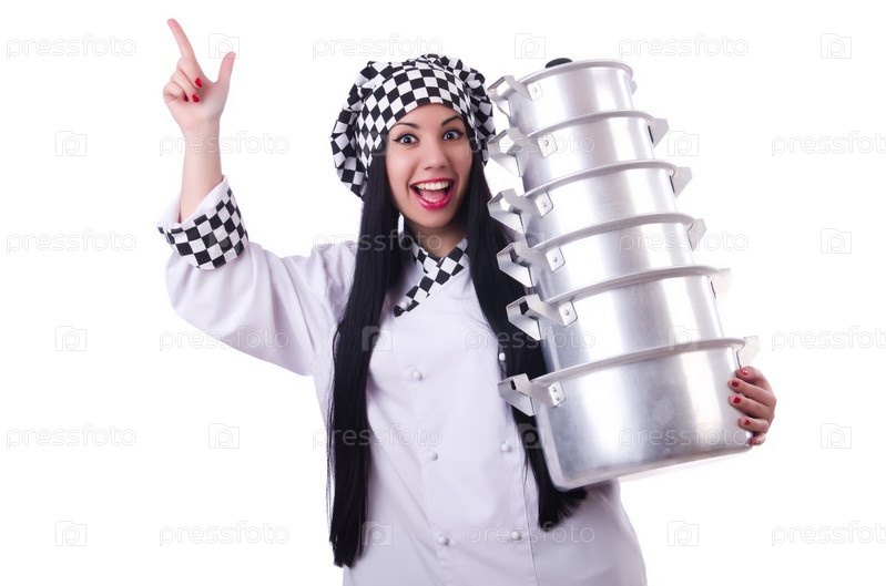 Повар с кастрюлями на белом