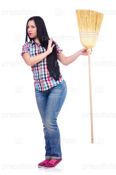 Молодая женщина с веником, изолированная на белом