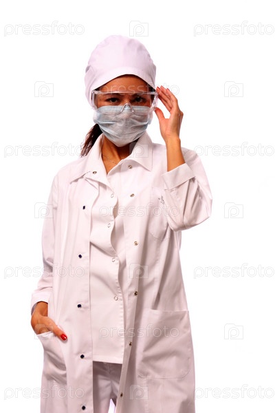 Молодая женщина в лабораторном халате на белом фоне