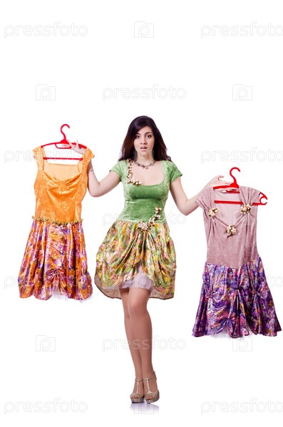 Женщина пытается выбрать платье, на белом фоне