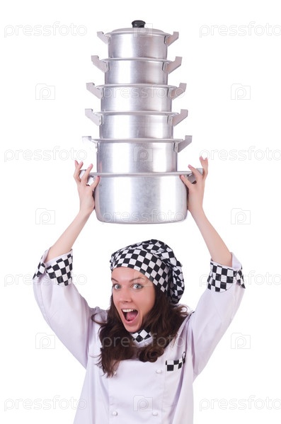 Повар с кастрюлями на белом фоне