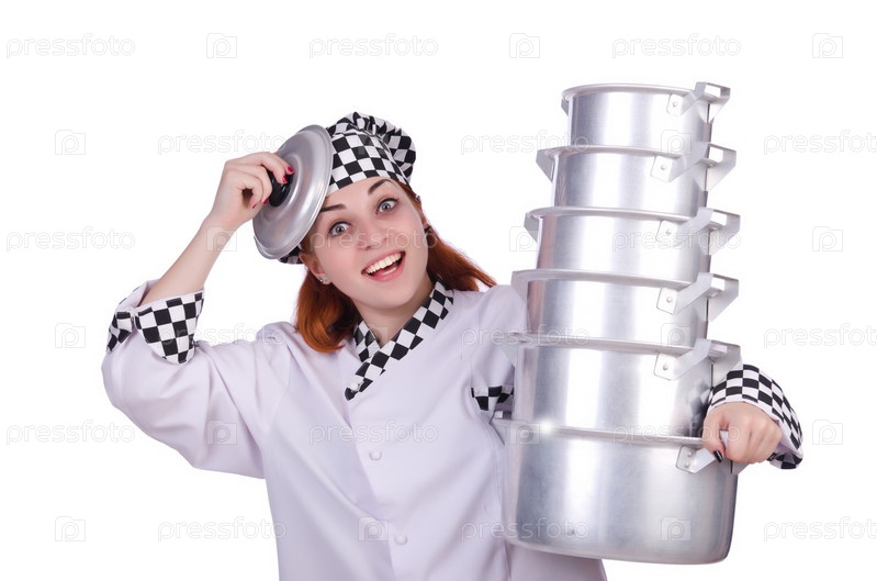 Повар с кастрюлями на белом фоне
