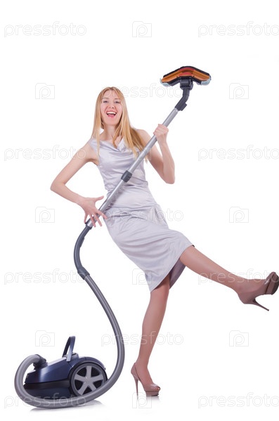 Молодая женщина с пылесосом на белом