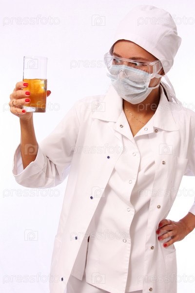 Молодая медсестра в лабораторном халате на белом фоне