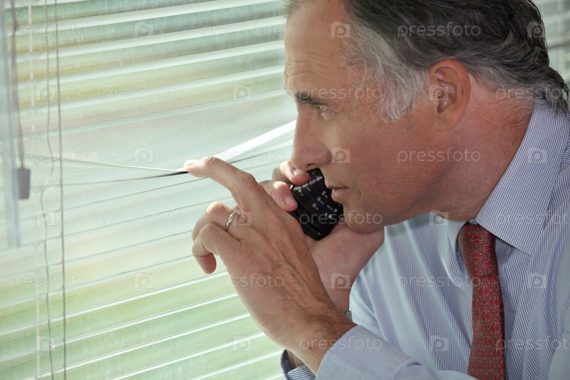 Шпион смотрит через жалюзи