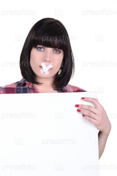 Разговорчивая женщина с заклеенным ртом