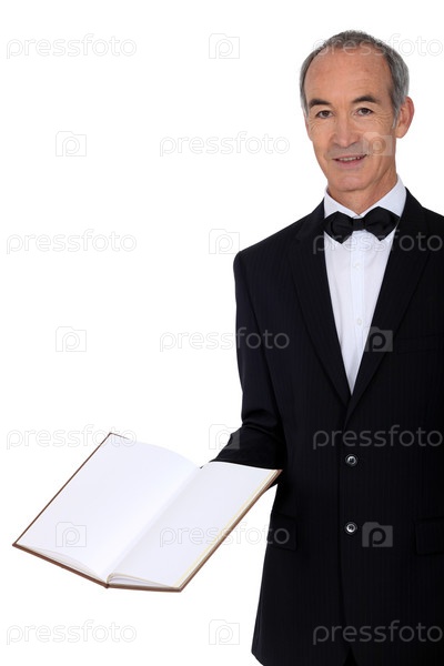 Пожилой официант держит меню