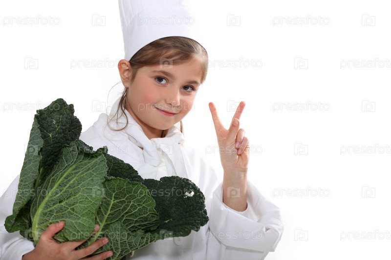 Маленькая девочка, одетая в форму повара, с капустой и знаком победы