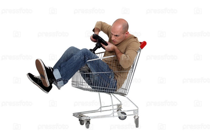 Мужчина в тележке с игрушечным рулевым колесом
