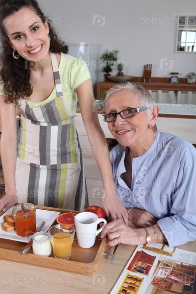 Пожилая женщина завтракает дома