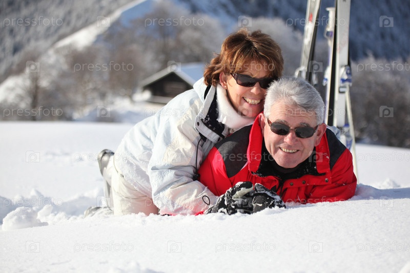 Пожилая пара играет в снегу