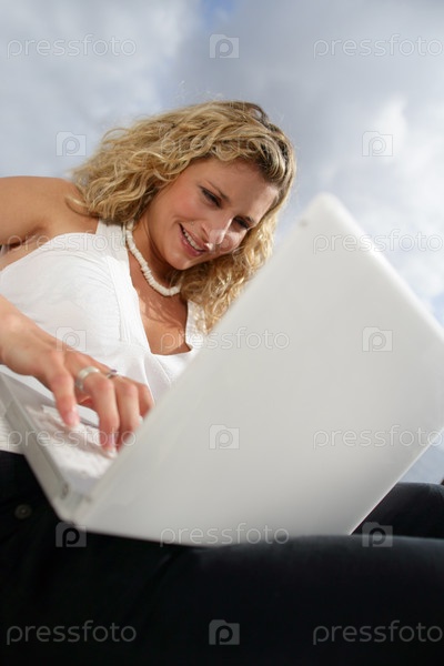 Молодая женщина с ноутбуком на открытом воздухе