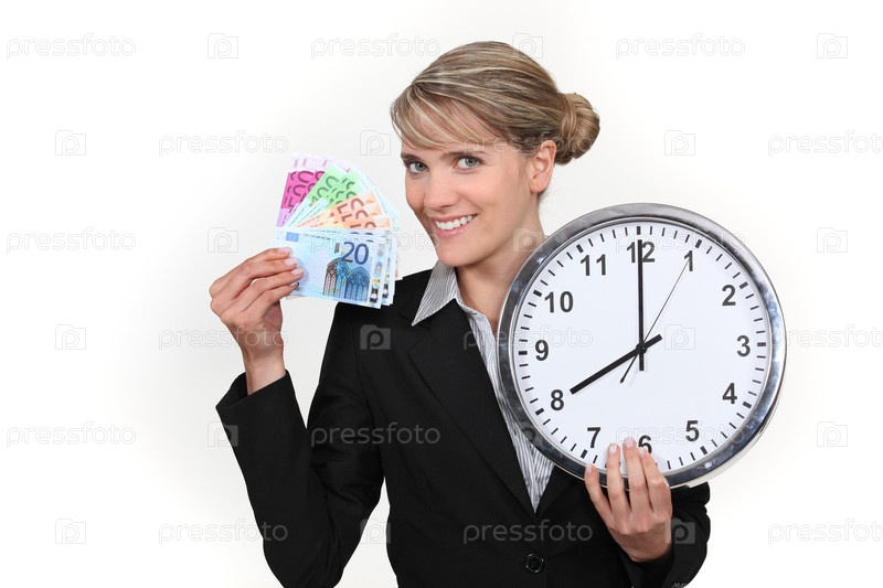 Женщина, держащая будильник и банкноты