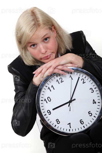 Блондинка опирается на большие часы
