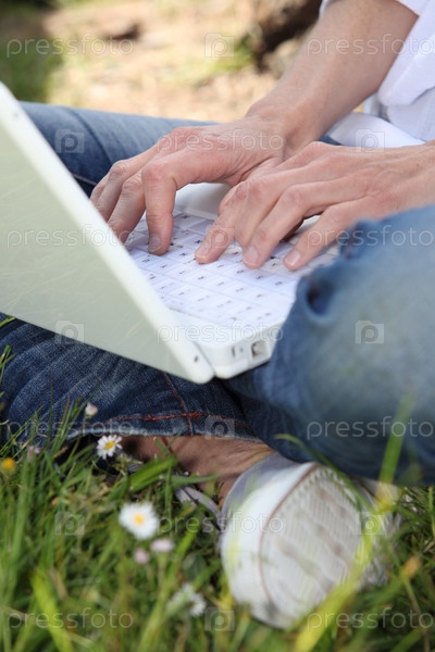 Крупный план женщины со скрещенными ногами перед ноутбуком