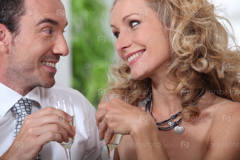 Пара пьет шампанское и смотрит в глаза друг друга