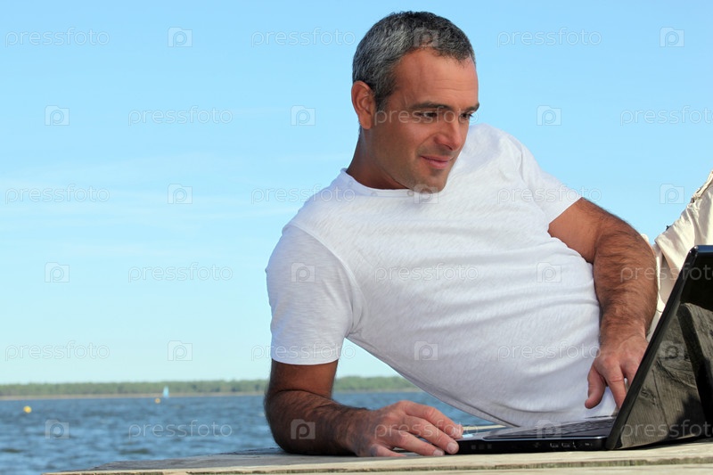 Зрелый человек с ноутбуком на улице