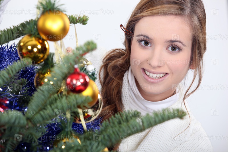 Молодая женщина украшает рождественскую елку